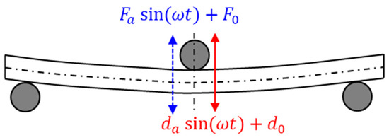 A three-point bend test has been used for high-modulus polymers, while a simple tension fixture is used for low-modulus elastomers or thermoplastic films as they can take large elastic deformations. A three-point bending loading is illustrated schematically in Figure 6, where a preset harmonic displacement is applied at the center of the specimen. An initial preload, , or displacement, , is applied to maintain the continuous contact of the crosshead with the specimen. The measured oscillatory forces are used to obtain the storage modulus from the following governing equation [12]: