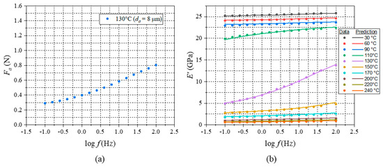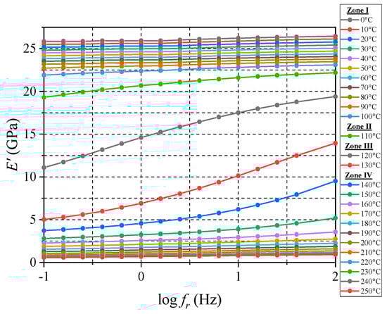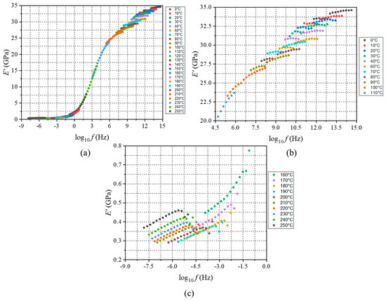 The master curve obtained through horizontal shifting is shown in Figure 7a. Discontinuities in the shifted data are evident. The glassy and rubbery regions are highlighted in Figure 7b,c, respectively. Although discontinuous, the data in the glassy region (0–110 °C) show a clear trend, while the data the rubbery region (170–250 °C) show no clear trend for temperature or frequency.