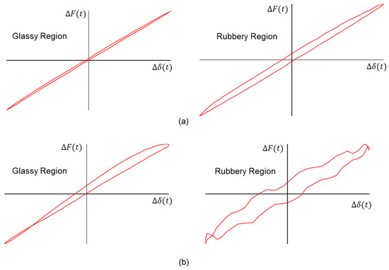 Representative oscillatory displacement and force data shown using Lissajous figures for (a) ideal responses and (b) unusual responses in glassy and rubbery regions, respectively.