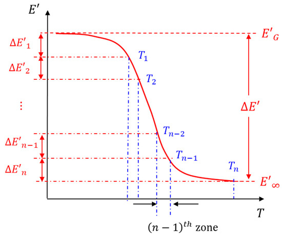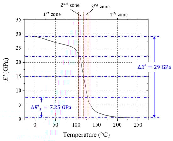 The 1 Hz testing results of the EMC specimen are shown in Figure 11. The modulus at 0 °C (glassy) and 250 °C (equilibrium) were 29.5 GPa and 0.5 GPa, respectively. The DMA machine had been practiced successfully for unfilled or lightly filled thermosets using a single amplitude during MFT sweeping. The changes in storage modulus over the glass transition region of unfilled or lightly filled thermosets have been reported to vary from 5 to 8 GPa [3,13]. Using these variations as a guideline, the storage modulus was divided into four zones of 7.25 GPa in this study.