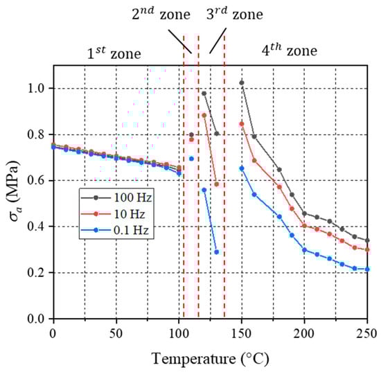 Figure 13 shows a plot of oscillatory stress amplitude vs. temperature at three different frequencies: 0.1 Hz, 10 Hz, and 100 Hz. The maximum stress ratio () was reduced from 50, for a single-amplitude MFT sweep, to 5 after the implementation of the proposed procedure.