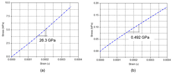 As the second step, monotonic load testing was conducted on the same EMC specimen. The stress vs. strain plots obtained from the monotonic tests at 0 °C and 250 °C are shown in Figure 14. The glassy and equilibrium moduli are 26.3 GPa and 0.492 GPa, respectively. It is worth noting that the data show an ideal linear relationship, which confirms that the EMC behaved elastically at those two extreme temperatures. TTS shifting was followed to generate a master curve and a set of shift factors. The master curve and shift factors are shown in Figure 15a,b, respectively.