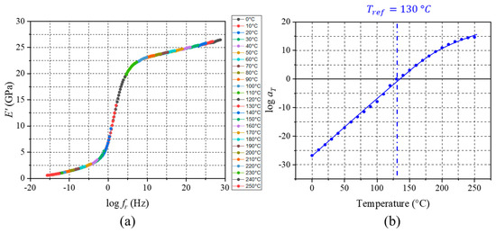 A commercial DMA machine (TA DMA 850) was employed to conduct the three-point bending test using the following test parameters: (1) an oscillation amplitude of 10 μm, (2) a frequency range of 0.1 to 100 Hz (5 points/decade), and (3) a temperature range of 0 to 250 °C (10 °C/step). The frequency–temperature sweeping data were processed to produce a master curve and a set of shift factors by the TTS shifting program provided by the DMA manufacturer.
