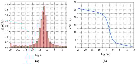 (a) Generalized Maxwell model constants () vs. , and (b) relaxation modulus master curve.