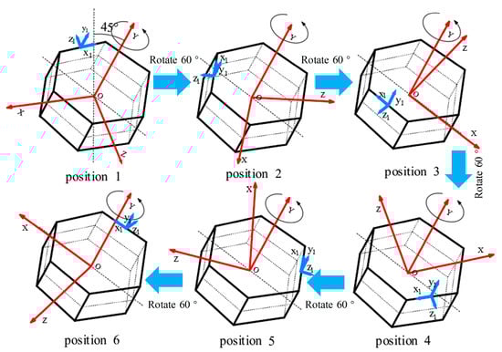 From the figure, it can be seen that, from position 1 to position 6, the carrier maintains a 45° tilt around the x-axis, and each position changes to the next position by rotating 60° around the y-axis.