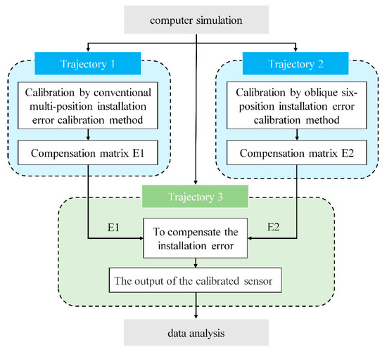 In this study, simulations were conducted using MATLAB R2022a to compare the performance of the conventional compensation method and the inclined six-position method. The compensation matrices E1 and E2 were derived for each respective method. Subsequently, a new motion trajectory was generated, and both the compensation matrices E1 and E2 were applied to it. Finally, the accuracy of the two methods was compared by analyzing the sensor outputs after applying the compensation matrices. The entire process is illustrated in Figure 5.