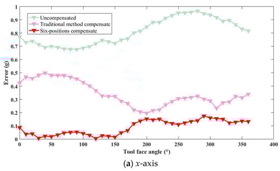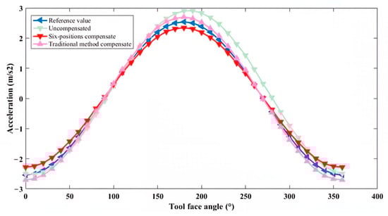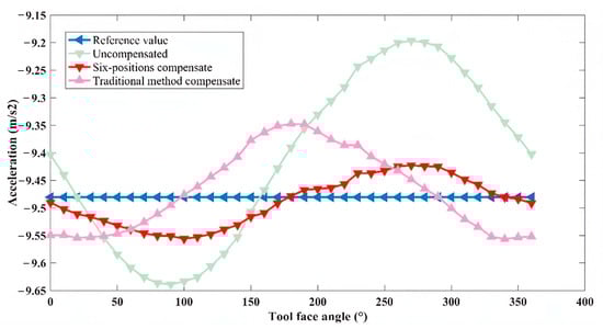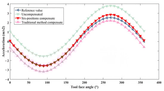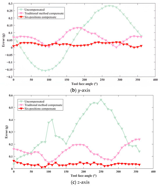 For the x-axis, the theoretical values without installation error, the uncompensated measurement values, and the compensated values using both traditional and new methods all exhibited a sinusoidal trend. Over the entire range of tool face angles from 0° to 360°, the new method achieved higher compensation accuracy than the traditional method. For the y-axis, assuming the y-axis orientation aligned with the drill pipe direction and no installation error was present, the theoretical values were represented by a straight line. Due to the presence of installation errors, the uncompensated measurement values exhibited a sinusoidal trend. After correction using the new method, although the values still exhibited a sinusoidal trend, the amplitude of the error was significantly reduced. On the other hand, after correction using the traditional method, the values followed a cosine trend, indicating lower compensation accuracy than the new method. For the z-axis, the uncompensated measurement values, as well as those corrected using both traditional and new methods, closely approximated the theoretical values without installation error. This result suggests that the installation error angle along the z-axis direction was negligible.