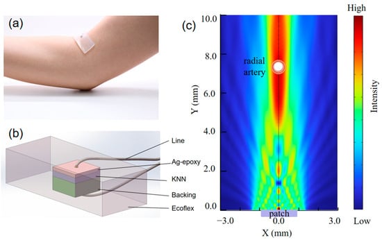 (a) Photograph of ultrasonic wearable patch adhering to skin for measuring the artery; (b) ultrasonic wearable patch structure; and (c) simulated sound field of patch at 5 MHz.