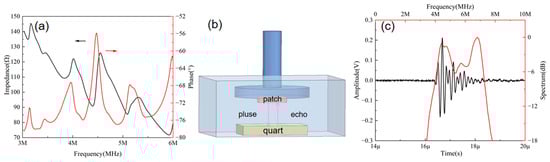 (a) Impedance phase results for the wearable patch. (b) Diagram of the pulse-echo testing environment. (c) Pulse-echo results for the wearable patch.