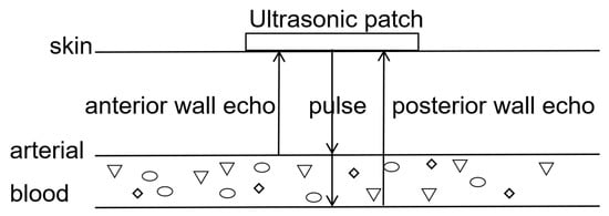 Human blood vessels are primarily composed of the adventitia, tunica media, tunica intima, and plasma [26]. For measurement convenience, the carotid or radial artery is generally chosen. Here, we propose a scheme for measuring radial artery blood pressure. The heart pumps blood to the arteries in a pulsating manner, and changes in blood flow velocity lead to changes in arterial diameter. The human cardiac cycle is about 1 s, during which blood is pushed from the heart towards the arteries [27]. The blood pressure inside the arteries increases, and the diameter expands to the systolic phase [28]. As blood flows back to the heart, the diameter of the arteries decreases to the diastolic phase. The principle of ultrasound blood pressure detection is shown in Figure 3.