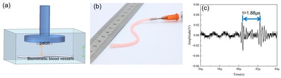 (a) Diagram of ultrasonic wearable patch measurement of biomimetic blood vessels. (b) Biomimetic vascular experimental patches. (c) Echo signals of biomimetic blood vessels.