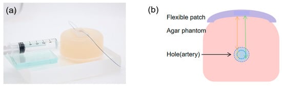 To simulate the human radial artery, agar was used to create platforms. Agar powder was mixed with water in a ratio of 3:150, stirred and dissolved at 90 °C, and then cooled into the desired shape. A hole with a diameter of 2–3 mm was drilled at a depth of 6–8 mm from the surface of the agar block to simulate the radial artery. Water was injected into the hole using a syringe to simulate the changes in blood during diastole/systole, as shown in Figure 5a. Water was injected into the hole through a syringe, changing the aperture size to obtain a series of pulse-echo signals. The principle of measuring vessel diameter using the agar phantom is shown in Figure 5b. The wearable ultrasonic patch was placed directly above the hole in the agar block and connected to the SMA using a pulse emitter/receiver (Olympus 5073PR, Waltham, MA, USA). Subsequently, an oscilloscope (DSOX3024A, Keysight, Santa Rosa, CA, USA) was used to receive and store the received waveform.