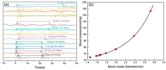 (a) Echo signals from simulated vascular phantoms with different aperture sizes tested using wearable patches. (b) Measured results (red dots) and the blood pressure–diameter relationship (black line).