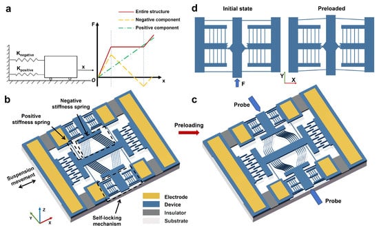 Equation (2) is derived by integrating Equation (1), where x represents the displacement from the initial state. The force–displacement curve based on Equation (2) is shown in Figure 1a. A cart connected to both negative and positive stiffness components moves along the x-direction from its initial position. As illustrated, the regions of positive and negative stiffness overlap such that the net force is nearly zero within a certain range. To generate the required negative stiffness, a preload method is implemented, as described in Section 2.1. Figure 1b illustrates the schematic of the proposed mechanism, comprising four main components: the positive stiffness unit, the negative stiffness unit, a self-locking mechanism for preloading control, and comb drive actuators. Additionally, Figure 1c presents the TSM after preloading with a probe.