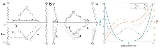 Let and denote the original lengths of the positive and negative stiffness springs, respectively. Following a horizontal displacement u, the left and right negative stiffness springs extend to lengths and , while the positive stiffness spring reaches a length of . The distance between the V-shaped negative stiffness springs and the center is denoted as s. Let represent the distance between the initial fixing point of the negative stiffness spring and the rod, and the angle between the negative stiffness spring and the rod is . The geometric relationships are established as follows: . According to Hooke’s law, the relationship between the system’s elastic potential energy E and the displacement u is expressed as follows: