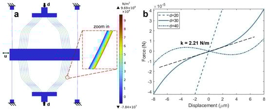 The simulation results are shown in Figure 3. As illustrated in Figure 3a, the maximum stress is less than 1 GPa. Figure 3b illustrates the variation in stiffness at different loading distances d. When the loading distance reaches 30 m, the stiffness is approximately 2.21 N/m. Additionally, the device exhibits bistable behavior at m.