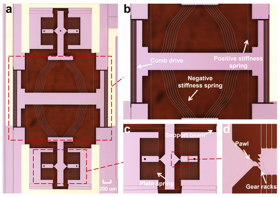 The prototype is fabricated using SOIMUMPs, with detailed fabrication steps available in the handbook [22]. Microscope images of the fabricated structure are shown in Figure 4. A dimensional adjustment was made to the self-locking mechanism to ensure proper functionality. As mentioned in Table 2, the standard spacing between the teeth of the rack gear is 15 m. However, during fabrication, if the initial gap between the pawl and the first tooth is too small, resolution limitations may cause them to adhere, hindering the preloading step. To mitigate this issue, the initial step distance is increased to 18.89 m.
