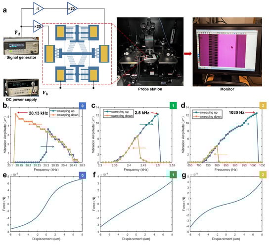 The experimental results reveal nonlinear behavior, which has been widely studied in MEMS comb-drive resonators. According to research [23], the observed response without preload is characteristic of a spring softening effect, while preload in Steps 1 and 2 provide a hardening effect, which is consistent with the simulation results shown in Figure 5e–g. The device frequency decreases from 20.13 kHz to 1.03 kHz. The effective mass is calculated to be kg. The stiffness is decreased from 602.62 N/m to 1.58 N/m, a reduction of 99.7%.