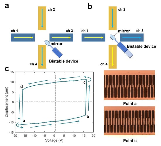 To investigate the bistable behavior, we further enlarge the preloading displacements in Step 3 to increase the negative stiffness of the structure. In this step, the pawl has advanced 48.89 m. The results indicate potential applications in 2 × 2 optical switches. As illustrated in Figure 6a, by integrating a bistable structure with a micromirror, positional changes can alter the signal output. The experimental results of the bistable behavior are shown in Figure 6c. The experimental setup is identical to the circuit shown in Figure 5a, with the signal generator replaced by a DC drive voltage. By adjusting the drive voltage, a reversible transition between two stable states is demonstrated.