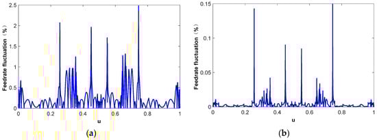 where ∆ui is the actual interpolation parameter increment; ∆si is the corresponding actual interpolation step length; α is the proportional coefficient between and ; and is the arc differential of the NURBS tool path at the interpolation point ui. If the actual interpolation parameter increment ∆ui is inconsistent with the parameter increment corresponding to the theoretical interpolation step length ∆si, the coefficient α in Equation (2) is not equal to 1. Under these circumstances, there is a deviation between the theoretical feedrate and the actual feedrate , and the feedrate fluctuation occurs. Since it is difficult to determine the analytical relationship between the arc length s of the NURBS tool path and the parameter u, the parameter increment ∆ui corresponding to the interpolation step length ∆ can only be derived by approximation methods, such as the Taylor series and the Runge–Kutta method. Due to the existence of the truncation error in the approximate method, it is bound to cause estimation errors in parameter increments, which inevitably causes feedrate fluctuation. The feedrate fluctuation can be defined by
