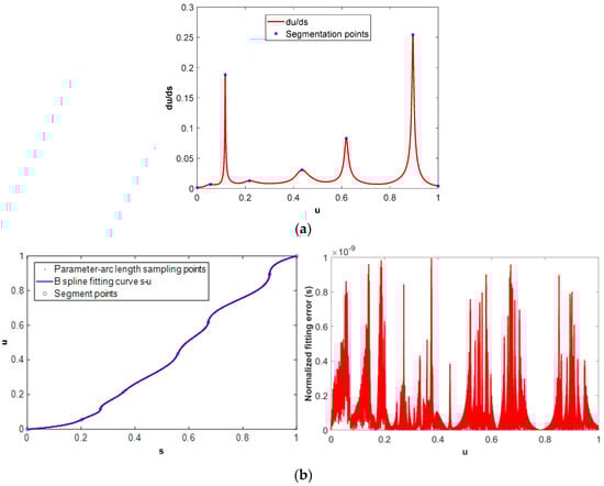 In order to fit the discrete parameter–arc length points (ui, si) to the B-spline curve u-s, the chord length parameterization method is used to parameterize the arc length si. Considering the high-precision requirement of the correspondence between arc length and parameters, the number of discrete sampling points (ui, si) is very large. Directly fitting all discrete points with B-spline curves will bring many issues, such as excessive calculation and uncontrollable oscillation during the fitting process. Therefore, it is necessary to divide the original discrete sampling points into small segments, in which the fitting process is performed, respectively. The segmentation principle of discrete points is to minimize the number of oscillations of the first-order derivative of the u-s curve. Therefore, the maximum value of du/ds is selected for segmentation, i.e.,