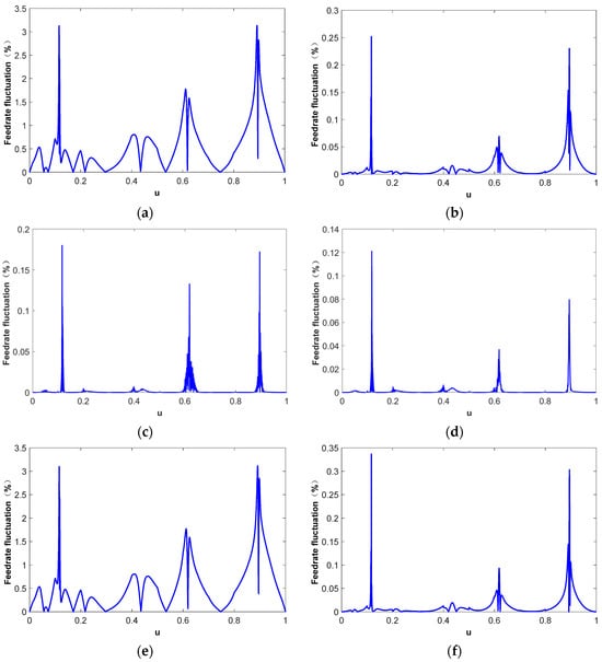 Without considering the estimation error of the parameter increment ∆ui, the feedrate fluctuation mainly comes from the deviation between the theoretical interpolation step length ∆ () and the chord length . This deviation can only be completely eliminated when the machining tool path is a straight line. On the contrary, in the high curvature area of the NURBS tool path, this deviation and the resulting feedrate fluctuation will become particularly obvious. As shown in Equation (5), if the parameter deviation of ∆ui is not taken into consideration, the actual feedrate will not be greater than the theoretical feedrate , since ≤ ∆.