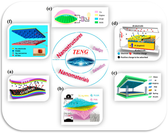 - Nurmakanov, Y.; Kalimuldina, G.; Nauryzbayev, G.; Adair, D.; Bakenov, Z. Structural and Chemical Modifications Towards High-Performance of Triboelectric Nanogenerators. Nanoscale Res. Lett. 2021, 16, 122. [Google Scholar] [CrossRef] [PubMed]