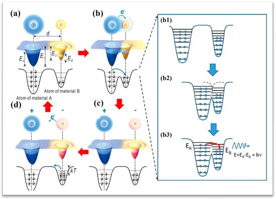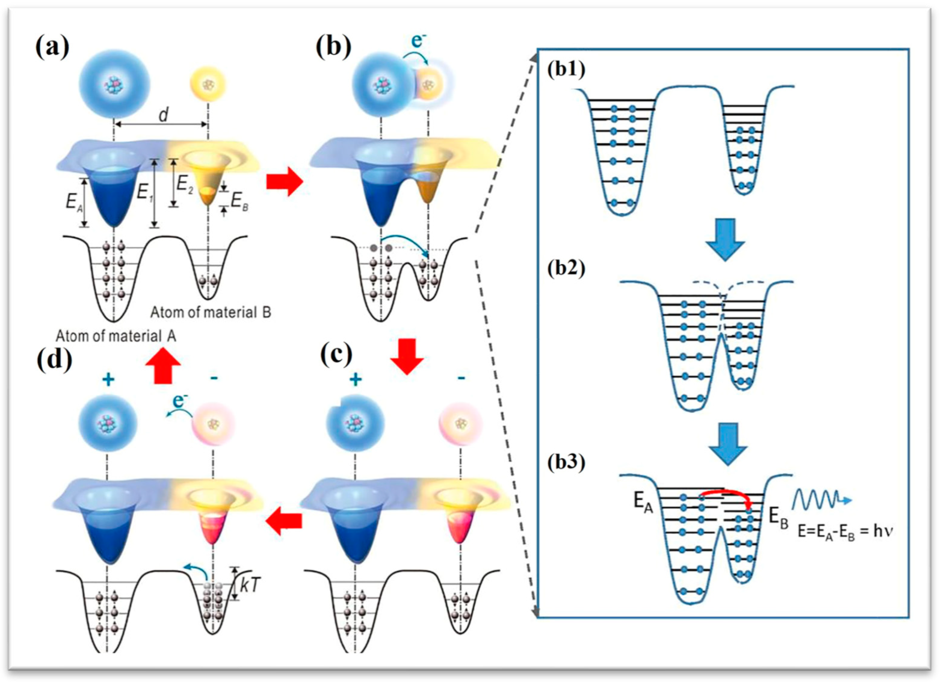 27] demonstrated atomically resolved photon emission signatures during solid-state CE processes, directly evidencing interfacial electron relocation events between atomic species of dissimilar materials during triboelectric interactions.