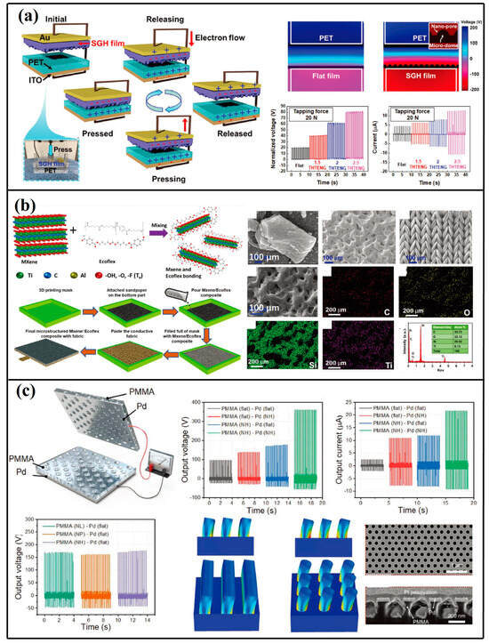 MXene–polymer composite systems have been engineered with diverse nanostructural configurations to optimize triboelectric performance. A textile-integrated TENG was developed through integration of MXene/Ecoflex nanocomposites with nylon-functionalized textile electrodes [