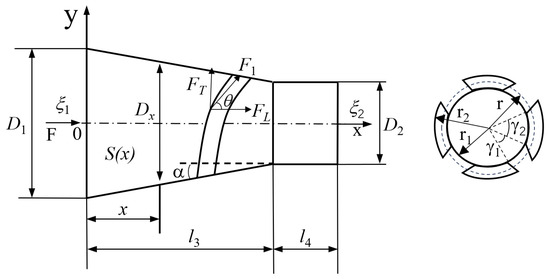 The design method for different types of horns varies based on the variation law of cross–sectional area. For a cone–cylinder composite horn, the corresponding vibration equation can be obtained using the shape function of the horn at all levels, and the frequency equation can then be derived based on the boundary conditions. A structural diagram of the cone–cylinder composite horn is shown in Figure 2.
