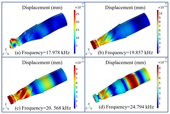 The reference value of the characteristic–frequency search was set to 20 kHz. The vibration modes of the four representative characteristic frequencies are shown in Figure 3. According to the experimental requirements, the longitudinal–torsional vibration mode must be output at the end face of the tool. Therefore, the resonance frequency of 19.857 kHz shown in Figure 3b corresponds to the required vibration mode for the experiment, with a 0.7% error compared to the theoretically designed frequency of 20 kHz.