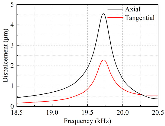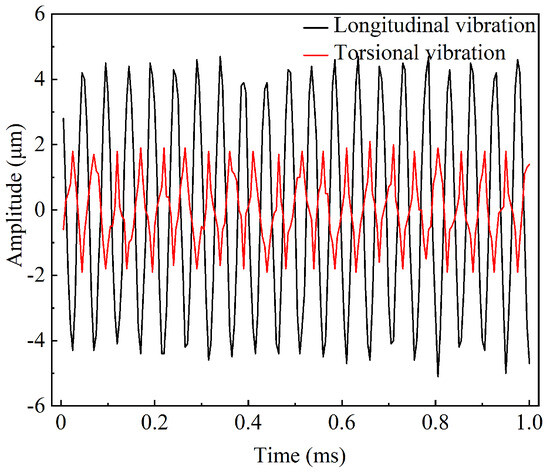 When the system’s excitation voltage is 300 V, the simulation results show the longitudinal–torsional vibration amplitude of the tool end face is shown in Figure 4. The longitudinal vibration amplitude is 4.6 µm and the torsional vibration amplitude is 2.3 µm.