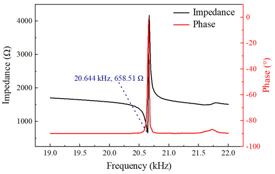 The impedance characteristics of the prototype were tested using a precision impedance analyzer (6630, MICROTEST, New Taipei, China) and the test results are shown in Figure 5. When the frequency was 20.644 kHz, the impedance of the system reached a minimum value of 658.51 . The 3.9 % deviation between experimental 20.644 kHz and simulated 19.857 kHz resonance frequencies primarily stems from practical machining tolerances and boundary condition differences between simulation ideal fixed constraints and experiment bolt preload effects.