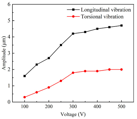 The energy transfer between the driving force and the mechanical system is most efficient at the resonance frequency, leading to maximum vibrational amplitude. Ultrasonic machining results in the highest energy transmission efficiency to the workpiece. The minimum impedance at resonance indicates that the system’s resistance to the external driving force is at its lowest, allowing for the most effective conversion of electrical energy into mechanical vibration. Laser displacement sensor (LK-H020, KEYENCE, Osaka, Japan) was used to measure the longitudinal torsional vibration output at the working end face of the ultrasonic longitudinal torsional vibration system under actual operating conditions. The excitation voltage was set to 300 V during the test; the amplitude test results are shown in Figure 6, with the longitudinal amplitude being 4.2 µm and the torsional amplitude being 1.8 µm. The longitudinal–torsional amplitude at the working surface increases with the rise in voltage, as shown in Figure 7. The relationship between the output amplitude and the voltage is not linear. When the voltage was gradually increased in increments of 50 V, the rate of increase of the amplitude was significantly lower than that at 300 V. The piezoelectric and elastic properties of the piezoelectric body are significantly constrained by nonlinear responses under high electric fields. As the voltage further increases, the piezoelectric material of the transducer gradually exhibits nonlinear characteristics, leading to distortion in the frequency response curves of various properties. Consequently, the electro–acoustic conversion efficiency decreases, resulting in a reduced amplitude growth [31,32]. Therefore, to ensure amplitude stability and higher processing efficiency, 300 V was chosen for the study. After comparing the simulation results and considering the effects of bolt preload and prototype errors during processing, the working performance of the ultrasonic vibration system is basically as expected.