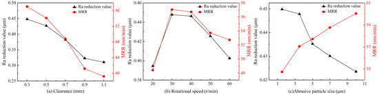 The influencing factors of surface roughness reduction and material removal rate: (a) clearance, (b) rotation speed, and (c) abrasive particle size.