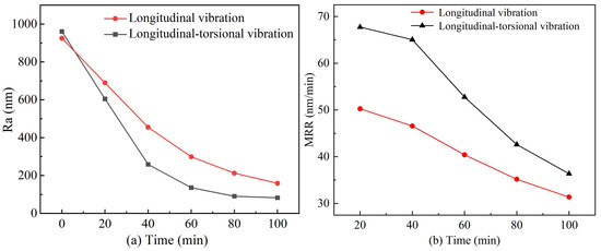 As shown in Figure 10a, after 100 min of the experiment, the surface roughness of the sapphire subjected to ultrasonic longitudinal vibration is reduced from 925.1 nm to 158.8 nm. Another study shows that optical devices with a surface roughness Sa of 0.2 to 0.4 µm can meet the requirements of ultraprecision machining [33]. In current ultrasonic vibration machining systems, ultrasonic–vibration–assisted grinding can reduce the surface roughness of workpieces to a range of 240–680 nm. The ultrasonic longitudinal vibration results align with existing literature on ultrasonic–vibration–assisted grinding [23,34,35]. The experimental results of ultrasonic longitudinal vibration in this study are consistent with the existing ultrasonic vibration grinding system. In contrast, the surface roughness of the sapphire exposed to ultrasonic longitudinal–torsional vibration is reduced from 960.6 nm to 82.6 nm, which is 48% lower than that achieved with ultrasonic longitudinal vibration. The reduction in surface roughness occurs due to ultrasonic longitudinal–torsional vibration, which causes the abrasive particles to move vertically and rotate horizontally. This composite motion increases the contact area and energy transfer path during abrasive grinding so that the tangential kinetic energy of the free abrasive increases so that the surface of the workpiece can be cut more evenly. The change in material removal rate is shown in Figure 10b. As the grinding time increases, the surface roughness of the workpiece gradually decreases, resulting in a smoother surface. The smoother the surface, the lower the material removal ability of the abrasive impact on the surface of the workpiece per unit time. The smoother surface has a smaller cutting depth and fewer rough peaks, which reduces the amount of abrasive cutting, thereby reducing the efficiency of material removal. Comparing the experimental results of longitudinal vibration grinding and longitudinal–torsional vibration grinding, it can be observed that the material removal rate of longitudinal–torsional vibration grinding is consistently higher than that of longitudinal vibration grinding across the entire grinding duration. This difference arises because longitudinal–torsional vibration introduces an additional torsional motion component, which enhances the relative motion between the abrasive grains and the workpiece surface, improving the cutting efficiency. The torsional vibration component increases the abrasive grain trajectory complexity, leading to a larger effective cutting area and a more uniform distribution of abrasive impacts. Consequently, the material removal rate remains higher compared to longitudinal vibration grinding.