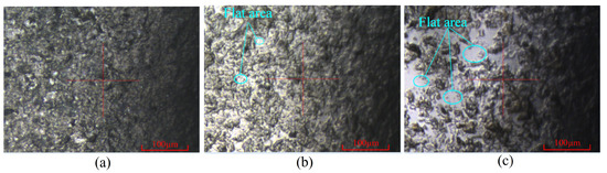 As shown in Figure 9a, the reduction in surface roughness and the material removal rate decrease with increasing processing clearance. When the clearance is set to 0.3 mm, the material removal rate reaches 57.05 nm/min. As the clearance increases, the transmission efficiency of ultrasonic energy through the grinding fluid gradually decreases. This leads to greater attenuation of the abrasive particles’ kinetic energy, weakening their impact on the workpiece and reducing the material removal rate. Furthermore, with a larger clearance, the likelihood of contact between the abrasive particles and the workpiece surface decreases, which further diminishes the effectiveness of reducing surface roughness. As shown in Figure 9b, when the rotation speed is below 30 r/min, the reduction in surface roughness and the material removal rate significantly improve with increased speed. However, once the rotation speed exceeds 30 r/min, the centrifugal force exerted by the grinding fluid becomes greater, causing the abrasives to be expelled from the surface of the grinding disc. The amount of grinding fluid supplied cannot compensate for this loss of abrasives, leading to a reduction in the effectiveness of ultrasonic grinding and, as a result, a decrease in the improvement of surface roughness and material removal rate. As shown in Figure 9c, increasing the size of abrasive particles decreases surface roughness reduction while increasing the material removal rate. The material removal rate reaches its peak at 60.04 nm/min when the abrasive particle size is 10 µm. Larger abrasive particles have a stronger cutting ability, enabling them to remove more significant volumes of material, thereby increasing the material removal rate. However, using larger particles tends to create deeper and more uneven craters on the workpiece surface, reducing the improvement in surface roughness. A comparison of the different experimental groups reveals that the optimal results are achieved with a clearance of 0.3 mm, a rotational speed of 30 r/min, and an abrasive particle size of 3.5 µm.