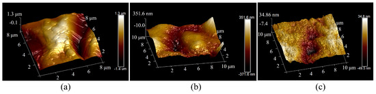 As shown in Figure 11, the surface morphology of the sapphire workpiece was characterized using Atomic Force Microscopy (Dimension Icon, BRUKER, Billerica, MA, USA), which provided high–resolution imaging to evaluate the post–grinding surface quality. In contrast, these flat regions were further expanded following ultrasonic longitudinal–torsional grinding, resulting in a more uniform surface flatness. As shown in Figure 12, the surface flatness of the workpiece improved to 723.2 nm after the ultrasonic longitudinal vibration process. The surface flatness was further enhanced to 84.3 nm with ultrasonic longitudinal–torsional grinding, representing an 88.3% improvement over the longitudinal vibration method. The significant improvement in the surface quality is attributed to the combined effect of longitudinal and torsional vibration.