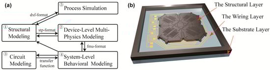 (a) Procedure of the system-level simulation; (b) model of the gyroscope structure.