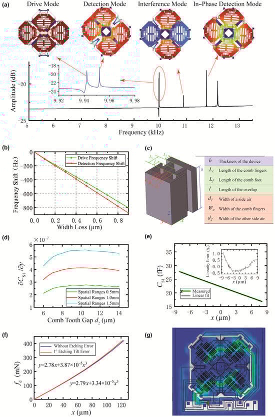 (a) Amplitude–frequency response showing the first five modal peaks; (b) relationship between linewidth loss and modal resonance frequency for drive (green) and sensing (red) modes; (c) model of a parametric comb structure with movable and fixed teeth; (d) relationship between comb finger gap and capacitance sensitivity across different spatial ranges; (e) simulation of driving capacitance vs. displacement with linear fitting and linearity error; (f) driving force vs. displacement in driving direction with and without 1° etching tilt error; (g) complete signal analysis with routing and structure, visualizing driving voltage flow.