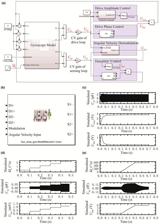 (a) System-level Simulink model comprises circuit model and reduced-order gyroscope sensing structure model; (b) reduced-order model of gyroscope sensing structure with input (left side) and output (right side) signal interfaces; (c) closed-loop drive simulation results showing the time variation in drive-sensing capacitance, amplitude control voltage, and phase control voltage (top to bottom); (d) open-loop sensing simulation results showing the time variation in angular velocity input, sensing capacitance change, and demodulated angular velocity signals; (e) closed-loop sensing simulation results showing the time variation in angular velocity input, sensing capacitance change, and force-balance voltage.