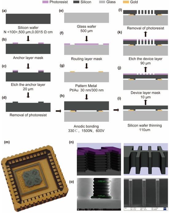 The processing results are shown in Figure 4m. Process simulation can check the compatibility of process steps and simulate the alignment of overlay marks. Through simulation, a qualitative understanding of process parameters and process errors can be obtained, which helps in the actual processing and debugging. Figure 4n presents the simulation of sidewall etching error and undercut, as well as the processing results of the comb fingers. Figure 4o shows the corresponding processing results, which are consistent with the simulation.