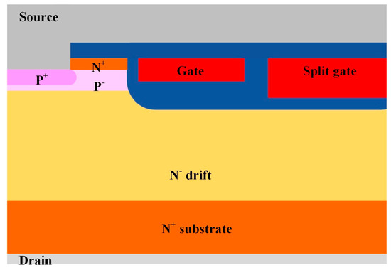 Owing to their ultra-low power consumption and fast switching performance, split-gate trench (SGT) power metal-oxide-semiconductor field-effect transistors (MOSFETs) have been developed rapidly in the field of medium–low voltage control and conversion in aerospace systems [1,2,3]. However, conventional SGT MOSFET devices are sensitive to heavy-ion irradiation and are prone to single-event effects, resulting in the degradation of device performance and even catastrophic failures during on-orbit operation such as single-event burnout (SEB) [4,5,6].