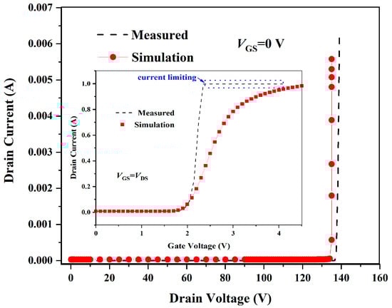 Comparison of transfer characteristics (inset of Figure 2) and breakdown characteristics of the 120 V-rated TSGT MOSFET obtained via measurements and simulations.
