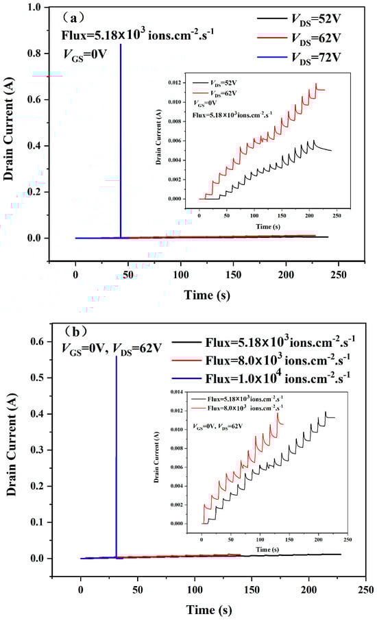 Figure 3a shows the changes in instantaneous drain current with time for 120 V-rated samples under different VDS conditions when flux = 5.18 × 103 ions·cm−2·s−1 and VGS = 0 V. To ensure that the sample is completely damaged after irradiation, the SEB damage judgment condition of the sample is set as ID or IG reaching the overcurrent protection value of the test system. The VDS value corresponding to SEB damage was defined as the SEB failure threshold voltage (VSEB), which was used to characterize the SEB properties of the sample. As shown in the insert of Figure 3a, significant drain current degradation occurred in the sample under test when VDS = 52 V and 62 V, respectively. The experimental results show that the overcurrent protection of the hardware test system is triggered by the heavy-ion incidence when VDS = 72 V, so the VSEB with the flux = 5.18 × 103 ions·cm−2·s−1 of the 120 V-rated TSGT MOSFET sample is 72 V.