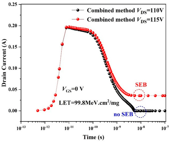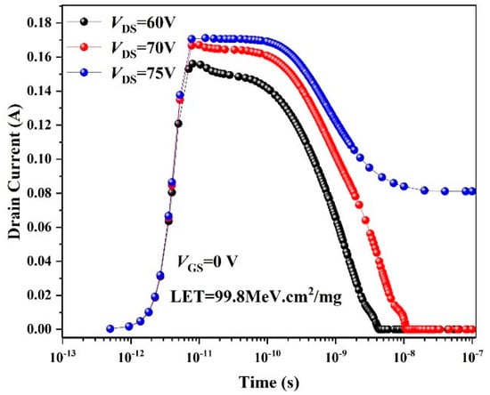 The simulation results of the SEB performance of the original TSGT structure against heavy-ion irradiation are shown in Figure 4. Transient drain current over time is simulated, in which the conditions involve a heavy ion with an LET of 0.998 pC/μm (1 pC/μm = 100 MeV·cm2/mg in silicon) [16] striking the channel location to penetrate through the structure. Consequently, when VDS = 75 V, the drain current appears as a long tail phenomenon that does not return to 0 A. The current is maintained near 0.08 A, which is far beyond the range of normal drain leakage current, indicating that the device has irreversible damage. Therefore, the VSEB of the simulated TSGT is 75 V, which is very close to the measured value shown in Figure 3a, and the error of ΔVSEB is 4.17%.