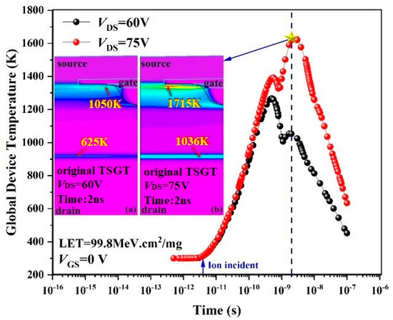 Trend of global device temperature for the 120 V-rated TSGT MOSFET after heavy-ion incidence. Maximum temperature distributions of the simulated structure for 2 ns after a heavy-ion strike at (a) VDS = 60 V and (b) VDS = 75 V.