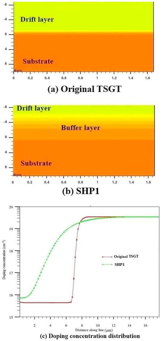 The structure distribution of (a) the original TSGT and (b) the hardening TSGT with the buffer layer fabricated using the optimal scheme SHP1 and (c) the doping concentration distribution for both devices.