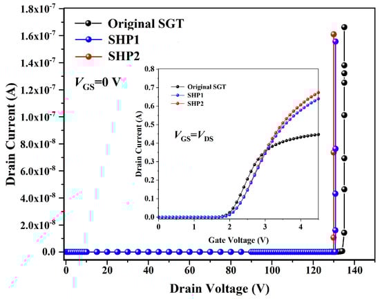 Comparison of transfer characteristics and breakdown characteristics of original TSGT, SHP1, and SHP2.