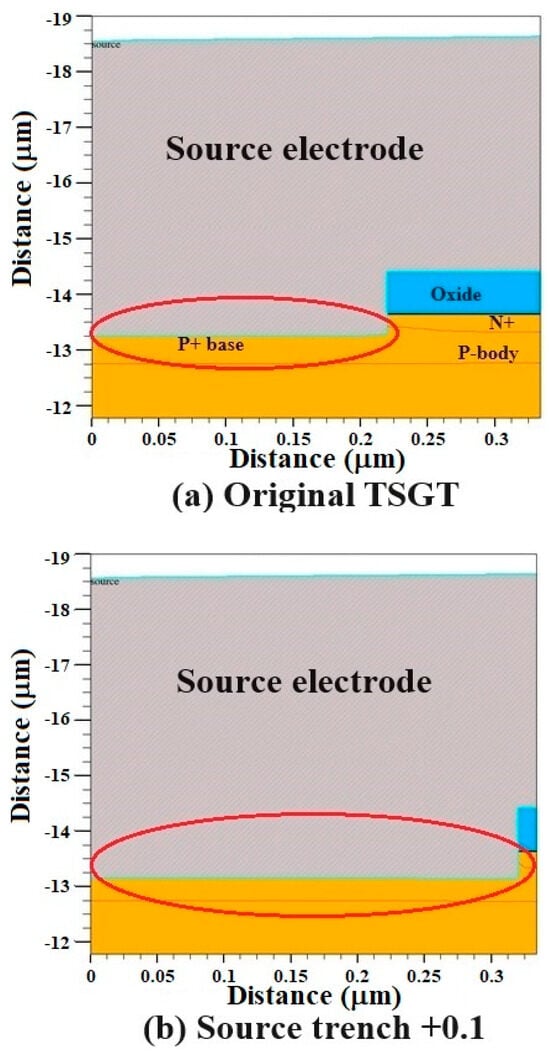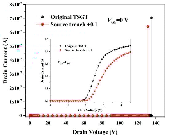Another hardening method that can effectively improve the SEB tolerance of 120 V-rated TSGT MOSFET is to optimize the source trench structure. As shown in Figure 9, based on the original TSGT structure, the source trench is extended horizontally and vertically, respectively, and the extension value is 0.1 μm, while the other structural parameters remain unchanged. We use the “source trench +0.1” to indicate the above reinforced structure. The SEB failure threshold voltage of the hardened device can reach to 105 V, as shown in Figure 10. Compared to the original TSGT structure, when VDS is large enough, the gate oxide electric field strength and range of the source trench extended structure increases significantly, and a wider range of electric field distribution exists near the N−-N++ junction between the drift region and the substrate. As a result, the electric field inside the device takes longer to rebuild, and the ID curve exhibits a platform phenomenon before the drain current reaches saturation when VDS = 105 V. Extending the source channel can effectively reduce the area of the parasitic BJT region and increase the on-state threshold of the parasitic transistor, thus effectively improving the VSEB of the device.